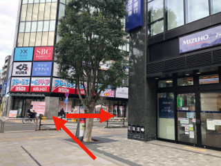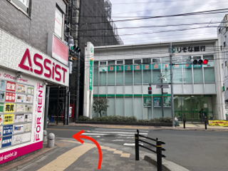 ④右に「みずほ銀行」が見えたら、横断歩道を渡り右に曲がります。